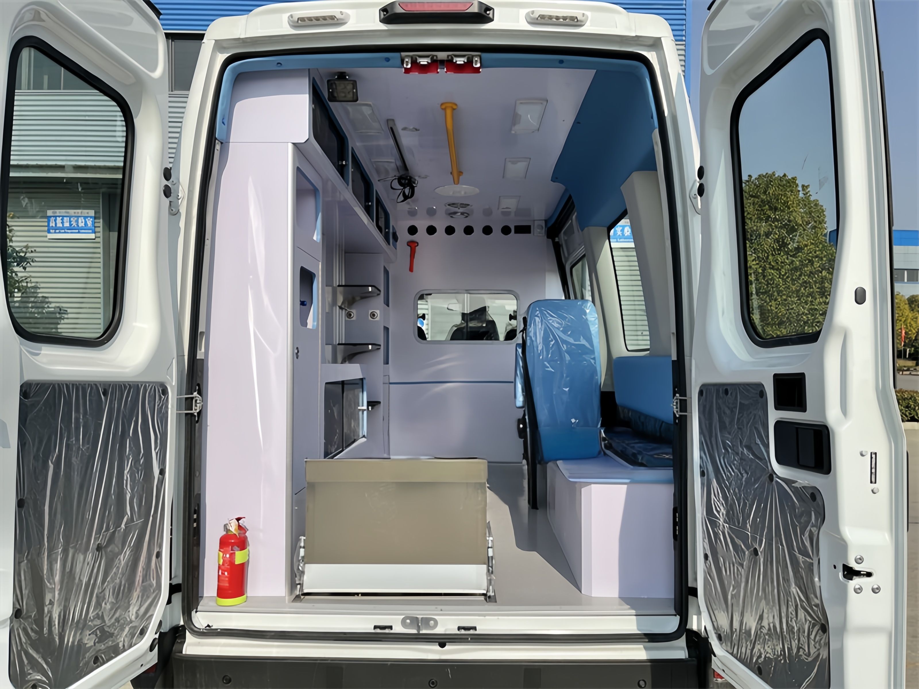 Appearance of vehicle | The car body is white, with body color strips and first aid signs, bright and eye-catching colors. The windows of the medical cabin are pasted with dark colors. Solar film (black film on the left window of the medical cabin, 2/3 frosted glass film on the right rear window) |